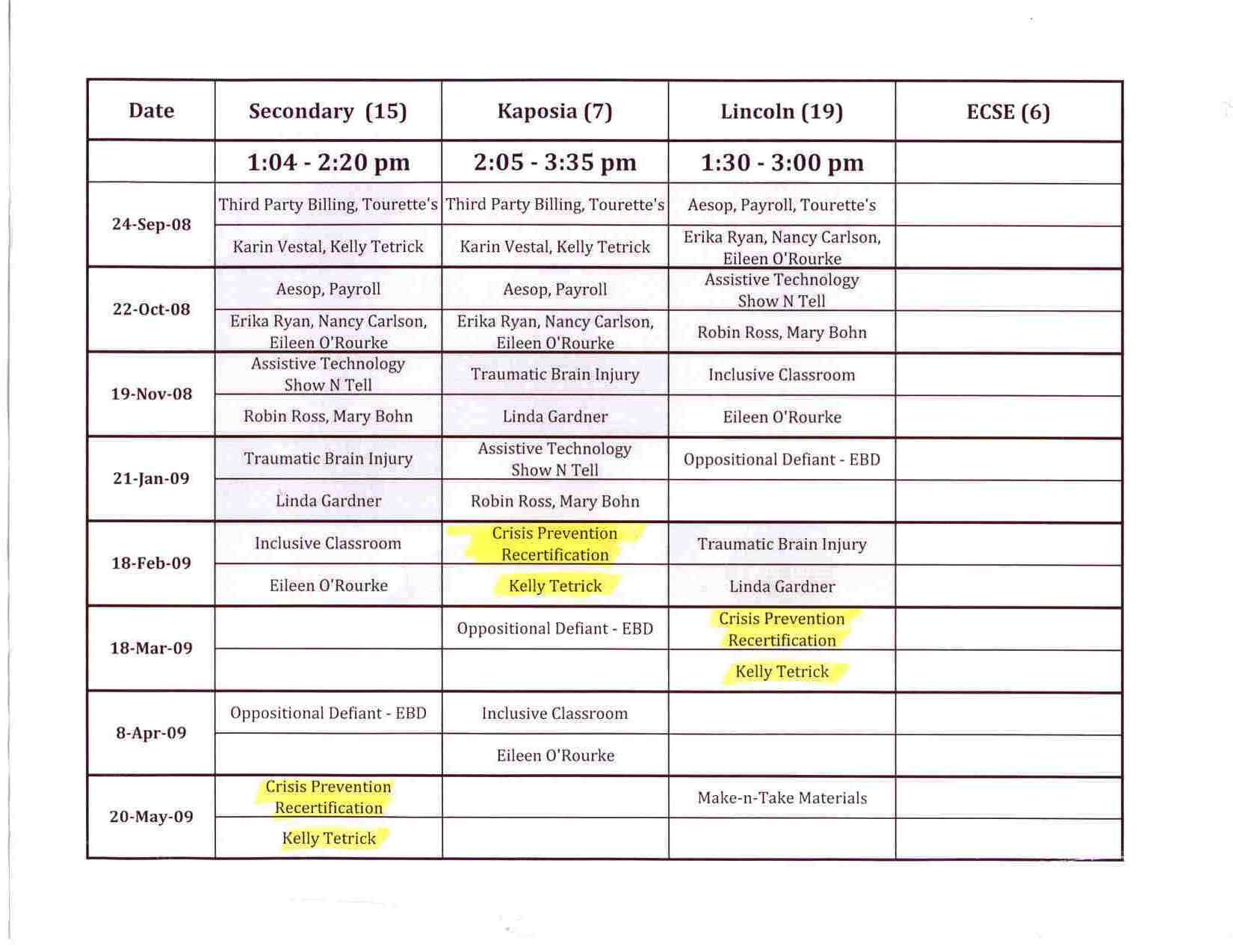 My leadership experience demonstrates a commitment to the belief that optimal teaching and learning is facilitated through a fluid series of partnerships working together rather than in isolation in an effort to positively impact student achievement. One of my best leadership qualities is the ability to work with teams, valuing ideas and opinions and using collaborative opportunities to contribute my knowledge base and gather information to make informed decisions. The staff development artifact illustrates this. As a Special education representative to staff development I initiated conversation around crisis prevention and behavior training. I continued over the course of 2 years to frame the issue as a district value. My artifact reflects work completed on this committee to collaboratively analyze need, time and staff development connections to identified guiding questions. Members represented all areas of the district learning community, contributing what they felt were the most important needs. I recognize the partnerships that must occur between educators (special education and regular education) as needs relate to student achievement. As a special education director I will be cognizant and encourage partnerships between the special education and regular education staff. I will be able to model this to staff as I have on various committees including staff development. Articulating purpose and direction is a skill I have as shown in the staff development schedule artifact that includes behavior support training.